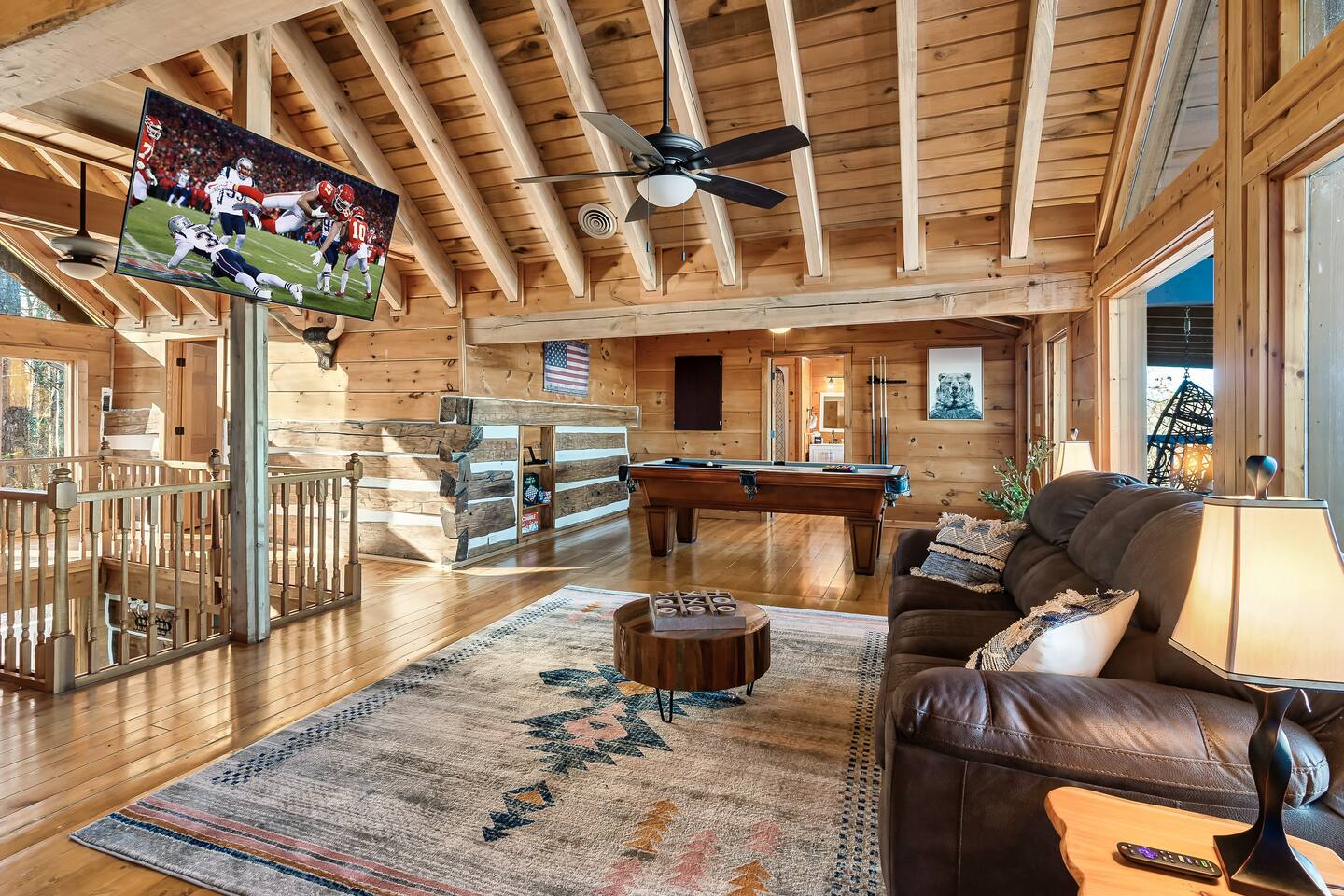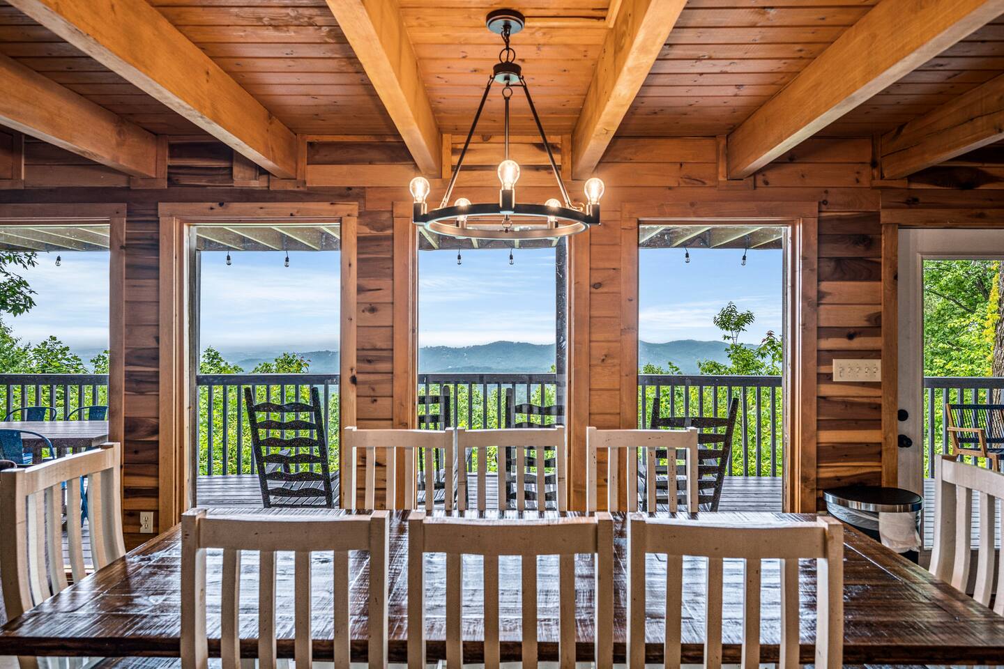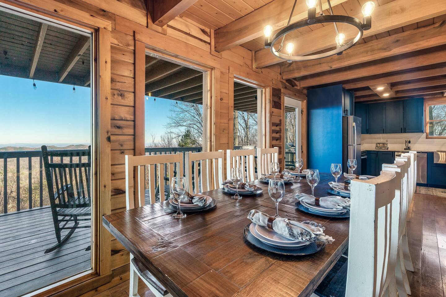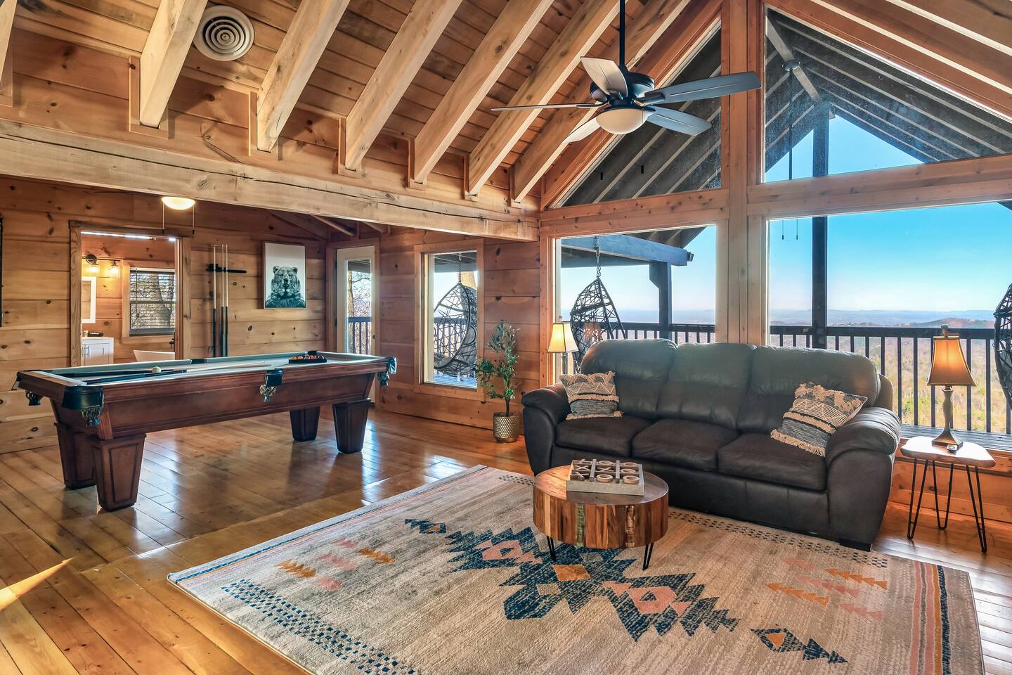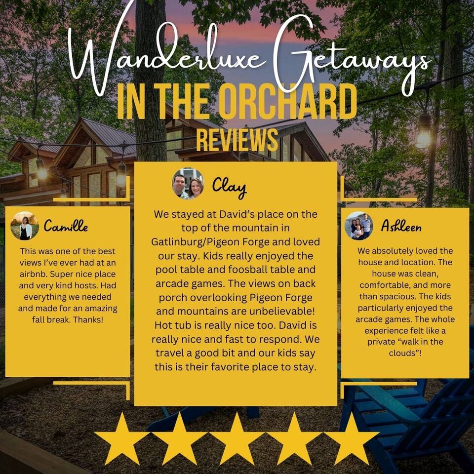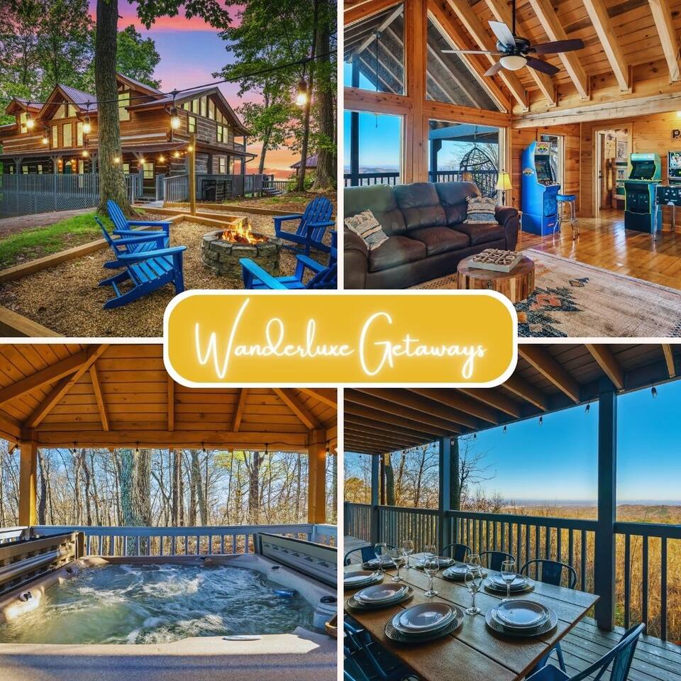 A whole cabin showcased by Wanderluxe Getaways!!!!!! KEY FEATURES: ☀ Extraordinary Views ☀ 5 bedrooms; 3 King beds, 2 Queen Beds, 2 Bunk Beds, 2 sleeper sofas ☀ Sleeps up to 20 ☀ 3 bathrooms ☀ Brand New Custom, fully equipped kitchen; new stainless steel oven, dishwasher and stove ☀ Coffee Bar ☀ Spacious living room; 65" HDTV, sectional sofa with pull out couch ☀ 2 full-length wrap around decks ☀ Fire Pit ☀ Hot tub ☀ WiFi throughout ☀ Game room ☀ Pool Table ☀ Arcade Games ☀ Swing Chairs