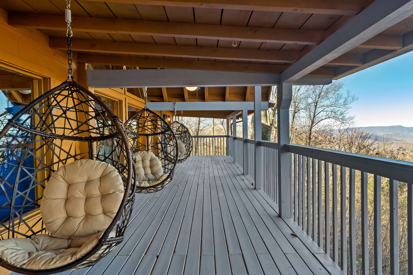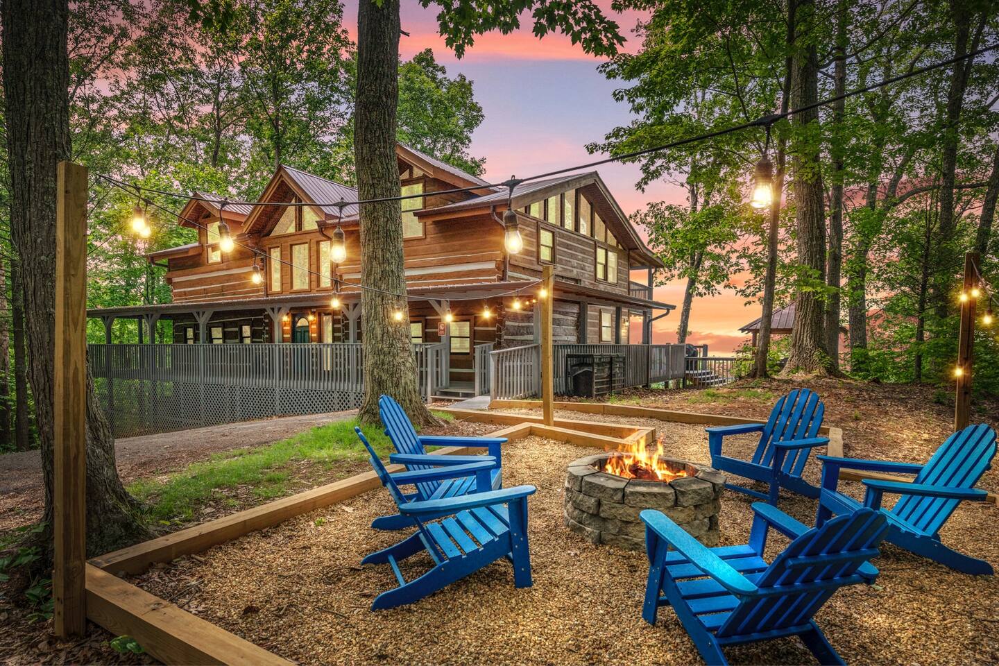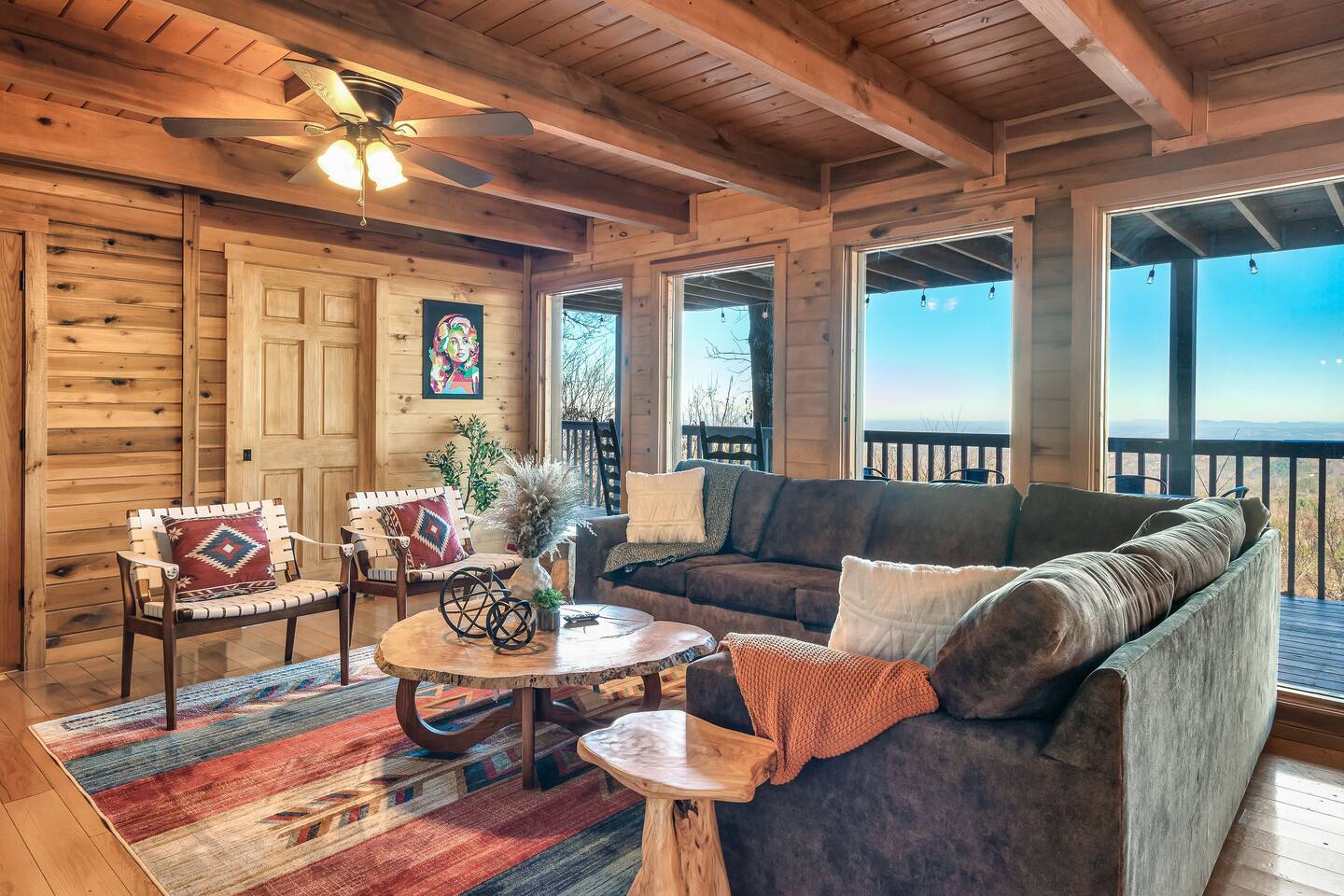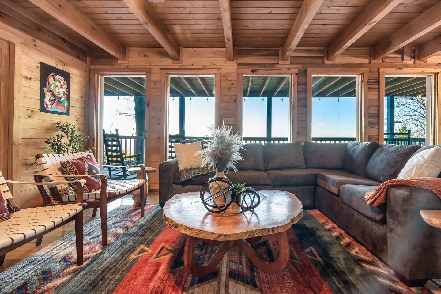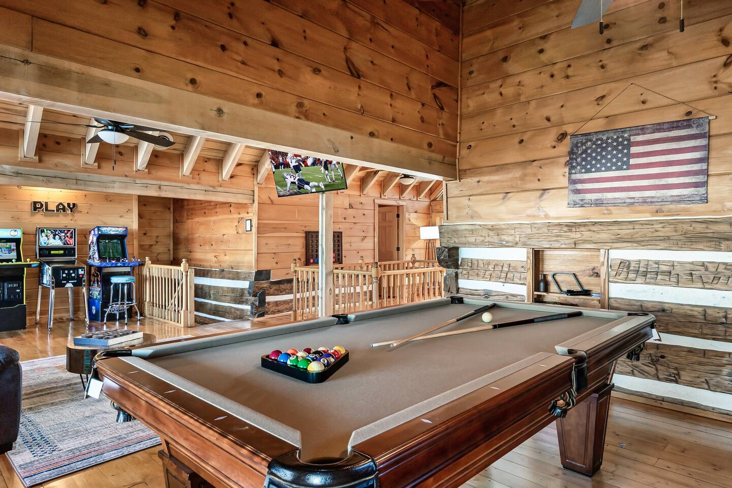 A whole cabin showcased by Wanderluxe Getaways!!!!!! KEY FEATURES: ☀ Extraordinary Views ☀ 5 bedrooms; 3 King beds, 2 Queen Beds, 2 Bunk Beds, 2 sleeper sofas ☀ Sleeps up to 20 ☀ 3 bathrooms ☀ Brand New Custom, fully equipped kitchen; new stainless steel oven, dishwasher and stove ☀ Coffee Bar ☀ Spacious living room; 65" HDTV, sectional sofa with pull out couch ☀ 2 full-length wrap around decks ☀ Fire Pit ☀ Hot tub ☀ WiFi throughout ☀ Game room ☀ Pool Table ☀ Arcade Games ☀ Swing Chairs